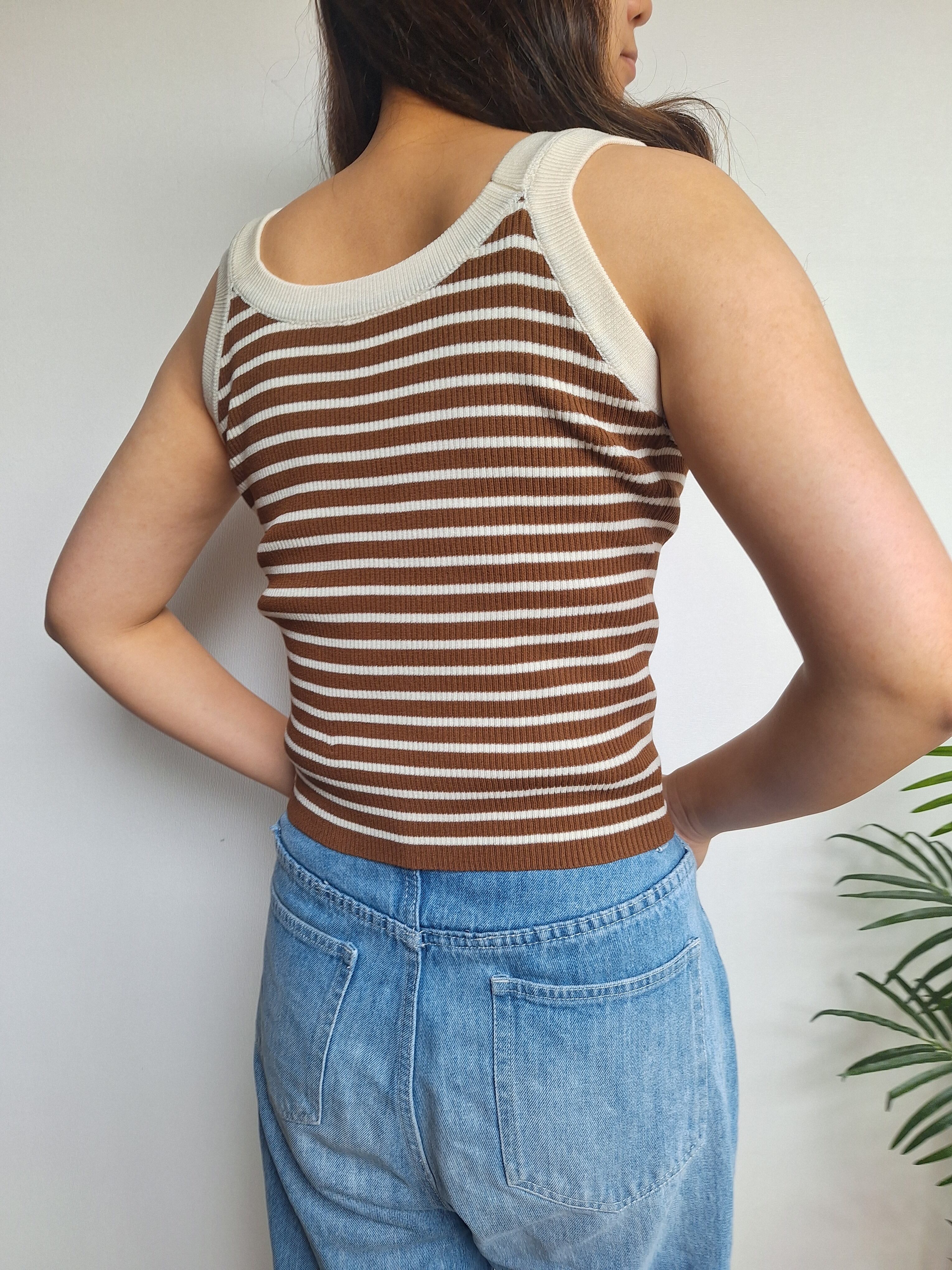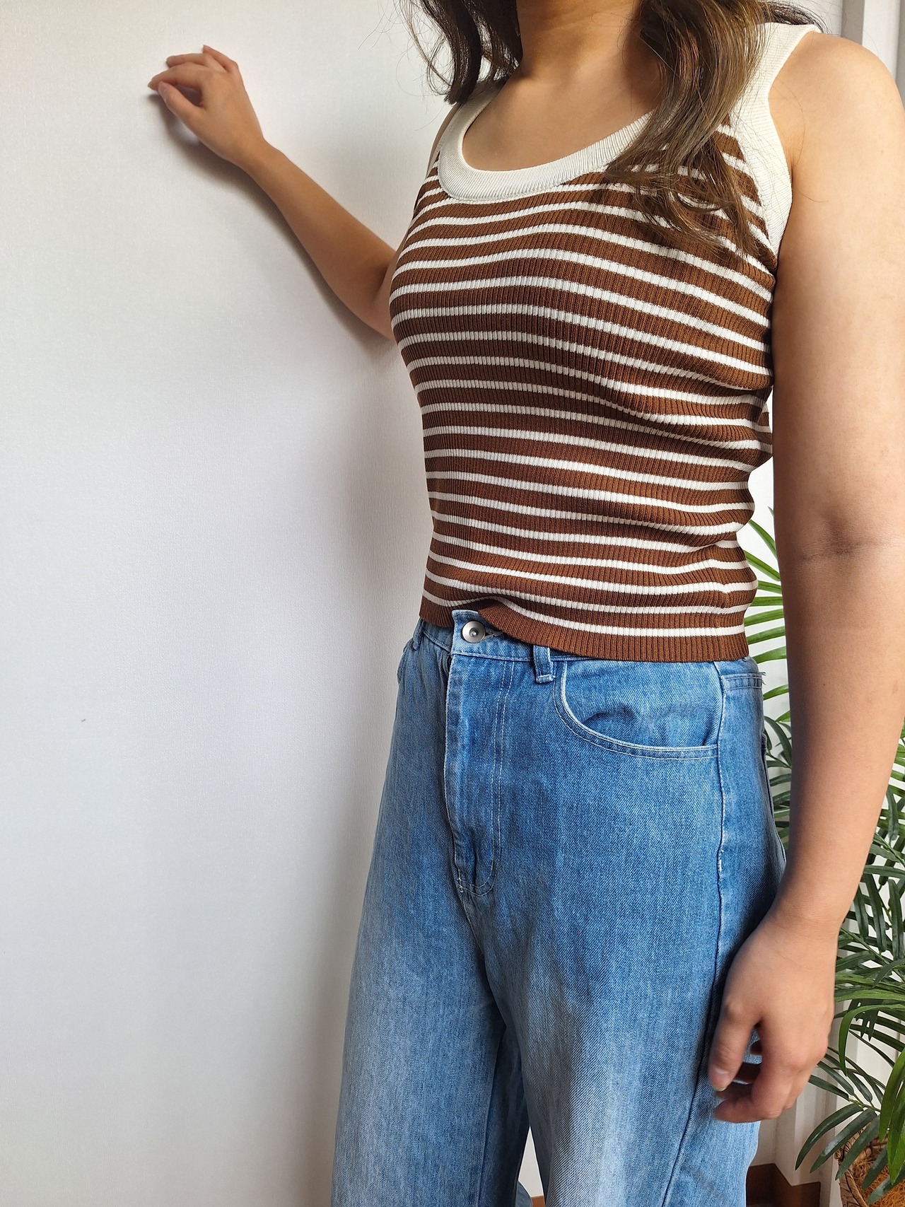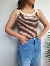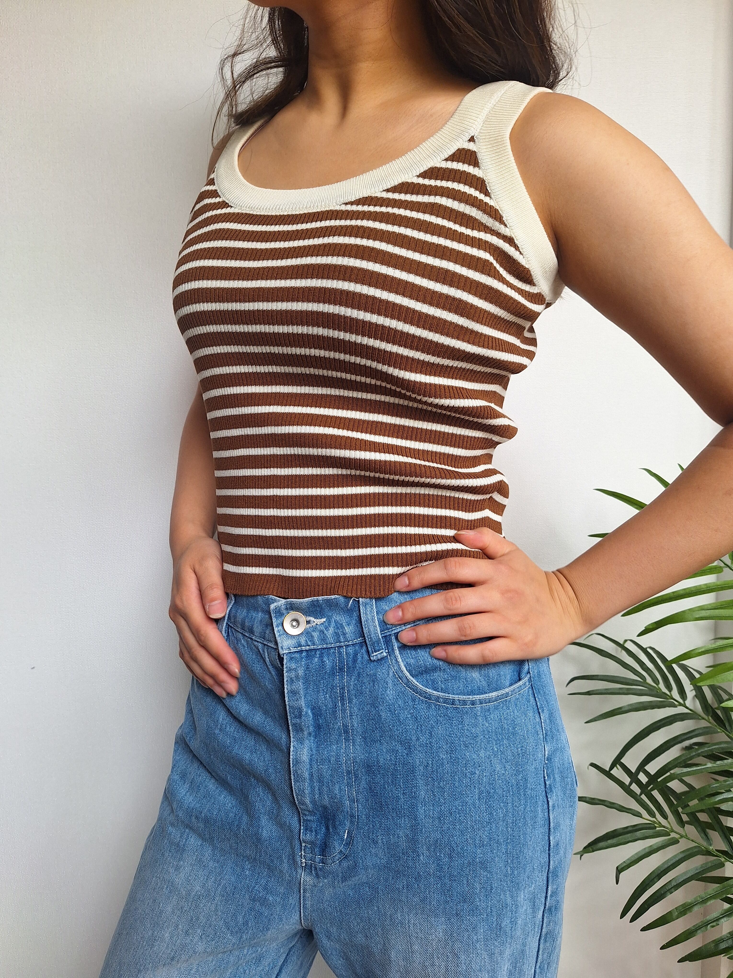 ボーダー柄の一枚で着映えするタンクトップ。しっかりと幅のあるショルダーストラップで、柄に合わせてバイカラーになっているのもポイント。伸びのある素材でストレスフリーな着心地です。夏場は1枚でサマになり大活躍。ボトムも選ばないのでいろんなシーンで手に取りやすいアイテムです。春はシアーアウターの中にアクセントとして取り入れるのがオススメ。