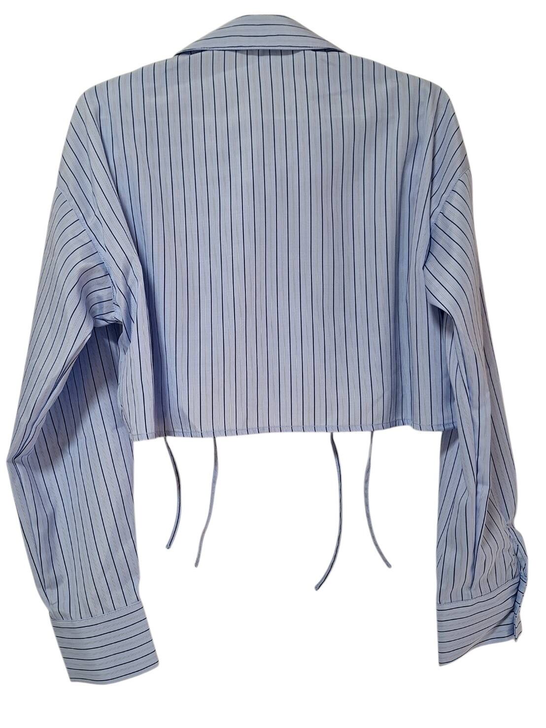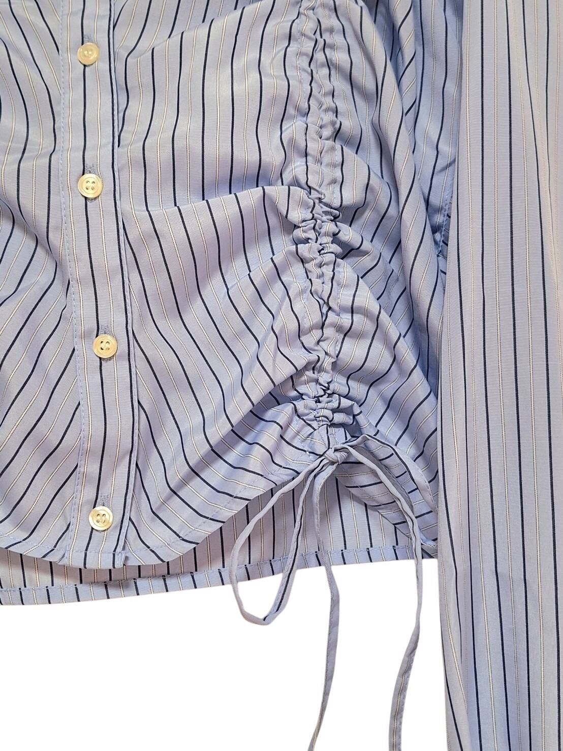 裾のリボンを絞れば、スリットのようなシルエットが完成するデザインシャツです。シャーリングデザインが程よくフィットしたシルエットに。袖口はつまり過ぎず、程よいワイドシルエットで抜け感がでてカジュアルにまとまります◎清涼感のあるストライプがコーディネイトのアクセントにぴったりです。ロングシーズン使えて着回しの効く一着です。